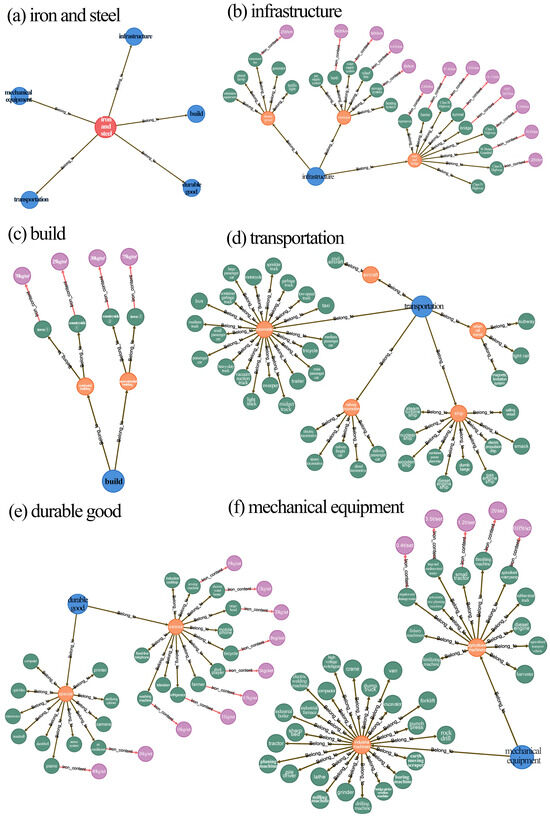 As can be seen in Figure 4, the steel-centered knowledge graph covers most of the significant steel-containing products and contains 172 nodes with 171 node relationships. Five main categories are included: buildings, infrastructure, machinery and equipment, transport, and durable goods. There are 14 subcategories: residential, non-residential, road girders, municipal, energy, industrial machinery, agricultural machinery, aircraft, automotive, light rail, ships, locomotives, general, and special. In the figure, circles represent concepts, entities, or attribute values, with colors distinguishing the types, where red labels represent the constituent items of iron and steel in urban minerals, blue labels indicate the five key categories, orange labels indicate the subcategories under the key categories, green labels indicate the products containing iron and steel, and purple labels indicate the iron content of the products. Entities or concepts are linked by directed edges, where the edges connecting the green and purple labels represent the ‘attribute’ relationship between entities and the attribute values. The red labels are connected to the blue labels, the blue labels are connected to the orange labels, and the orange labels are related to the green labels. The lines connecting the red labels to the blue labels, the blue labels to the orange labels, and the orange labels to the green labels represent ‘containment’ relationships between parent and child concepts, and between concepts and entities.