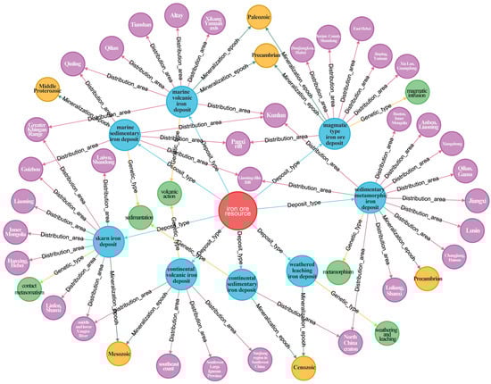 China is rich in iron ore types. Li et al. [46] classified the iron ore deposits in China into six categories according to their genesis: sedimentary metamorphic, magmatic, volcanic, sillimanite, sedimentary, and weathering and leaching. Among them, the volcanic type can be divided into marine and terrestrial volcanic rocks, and the sedimentary type can be divided into marine and terrestrial sedimentation. Figure 5 shows the knowledge map of the primary iron ore mineralization process in China, including the deposit type, mineralization time, genetic type, and distribution area. The time of mineralization and the genetic type are the most critical time and action factors of the mineralization process.