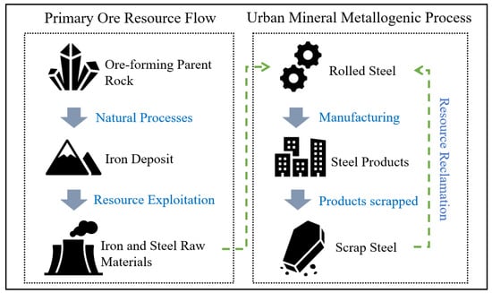The process of mineralization of primary minerals depends mainly on natural factors. Iron ore is gradually formed and enriched in the parent rock of mineralization by geological action. For example, sedimentary iron ore deposits [47] are formed when iron-bearing rocks or ore bodies exposed on the surface are crushed, transported, and then deposited under the weathering process. In contrast, the mineralization process of urban minerals is more complex, the driving factors are complicated, and a single law cannot describe the mechanism. The mineralization process of urban minerals is similar to that of primary minerals, such as the temperature and pressure conditions during the formation of iron ore deposits. Urban mineralization also requires physical or chemical conditions, but unlike the unidirectional rotation of primary minerals, urban minerals can be recycled. Urban minerals of iron and steel are derived from primary iron ore, as shown in Figure 6, which briefly illustrates the cycling of iron and steel resources from the natural world into human society. Still, the formation mechanisms of urban iron and steel mineral are complex. Therefore, to analyze the process of iron and steel mineralization in urban minerals, it is necessary to first divide the process, define the relationships, and clarify the properties.