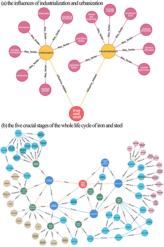 According to the material flow of the whole lifecycle of iron and steel minerals from mining to end-of-life recycling, the knowledge graph of the mineralization process of iron and steel was constructed. It is shown in Figure 7. It includes vital technologies and influencing factors in the iron and steel mineralization process and contains a total of 85 key nodes and 110 node relationships. Different colors of the circles are divided according to the node types. The red label is iron and steel. The blue label is the five crucial stages of the whole lifecycle of iron and steel. The green color is the form of iron and steel in different states. Purple is the main product type in the use phase. Light blue is the main manufacturing process. Apricot color is the reaction condition. Yellow and rose represent the influences of industrialization and urbanization, respectively. The colors of the directed edges between the nodes are yellow, orange, brown, blue, grey, and rose, depending on the type of relationship.