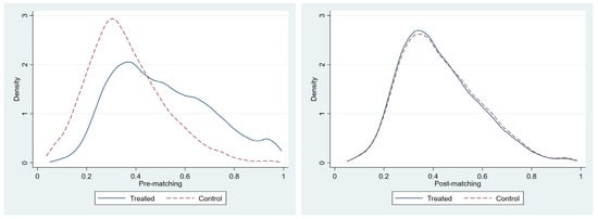 First, we used the propensity score matching method to overcome self-selection bias. According to whether the firms had artificial intelligence patent applications, we divided the samples into a treated group and a control group, and we took the control variables in Model 1 as the matching criteria using the 1:1 nearest neighbor matching method with put-back. Figure 1 presents the kernel density plots of propensity scores for the treated and control groups before and after PSM matching. We observed that prior to matching, the propensity score distributions of the two groups differed substantially. After matching, however, the curves aligned more closely, with a significantly increased overlap area. This suggests that the covariates were well-balanced between the treated and control groups in the post-matching sample. Moreover, the results of the balance test show that the standardized deviations of the covariates after matching were less than 8%, and the results of the t-test did not reject the null hypothesis that the coefficients of the treated group and the control group were not significantly different. This shows that the characteristic difference between the experimental group and the control group was eliminated to a large extent, and the matching effect was good. The t-value of the average treatment effect (ATT) after matching was 34.29, which was significant at the 1% level, indicating that matching was effective. We used the matched samples to conduct regression analysis on Model 1 again, and the test results of the matched samples are shown in Column (1) of Table 6. The regression coefficient of AI was significantly positive. The results show that the conclusions of this study are still robust when the self-selection bias problem is mitigated.