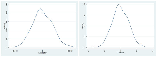 To further eliminate potential interference from unobservable factors in the estimation results, we conducted a placebo test. Specifically, if the positive impact of artificial intelligence (AI) on corporate green collaborative innovation (GCI) were driven by unobservable factors, such an effect would persist even when artificial intelligence indicators were randomly assigned to target firms. Therefore, we randomly assigned the annual artificial intelligence indicators to listed companies in the sample and then repeated the regression of artificial intelligence (Random_AI) and corporate green collaborative innovation (GCI) in random order 1000 times according to Model 1. The results of the placebo test are shown in Figure 2. As illustrated in the left panel of Figure 2, the regression coefficients derived from the randomized simulations exhibited a normal distribution centered around zero, and the absolute values of these coefficients were consistently smaller than the empirically observed coefficient of 0.1193 (see Column (4) in Table 3). Furthermore, the right panel of Figure 2 reveals that only a minimal proportion of the regression coefficients were statistically significant (either positive or negative). These findings indicate that the virtual treatment effect constructed in this study does not exist, which fully indicates that the conclusion that the application of artificial intelligence technology can significantly improve the level of enterprise green collaborative innovation is not caused by other unobservable factors. This further validates the robustness of our findings.