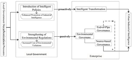 Second, as suggested by the Porter Hypothesis [22], local government decarbonization pressures strengthen environmental regulations, raising compliance costs for enterprises and “forcing” them to decarbonize through internal environmental governance passively [22]. Some enterprises may pursue source-based governance, which primarily relies on intelligent products and technologies, to optimize production processes, while others may resort to lower-cost end-of-pipe governance by installing pollution control devices like desulfurization and dust removal systems [23]. However, in response to local governments’ long-term focus on ecological governance performance, an increasing number of enterprises are moving toward source-based governance to achieve decarbonization and avoid penalties, thereby advancing urban industrial intelligence.