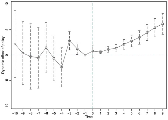 The coefficients of the above regression are presented in Figure 2. The coefficient estimates for most periods preceding the implementation of the LCCP policy are not significantly different from zero, and no significant trend is observed. However, after the implementation, the coefficient estimates are significantly greater than zero and show an increasing trend over time. This indicates that there were no significant differences in the levels of industrial intelligence between pilot and non-pilot cities prior to the policy implementation, confirming that the model satisfies the parallel trend assumption.