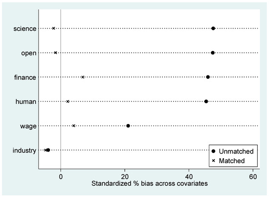 First, covariates are chosen based on balance test results between the treatment and control groups in Table 6. The test results indicate that wage, human, finance, open, industry, and science can serve as covariates for Propensity Score Matching.