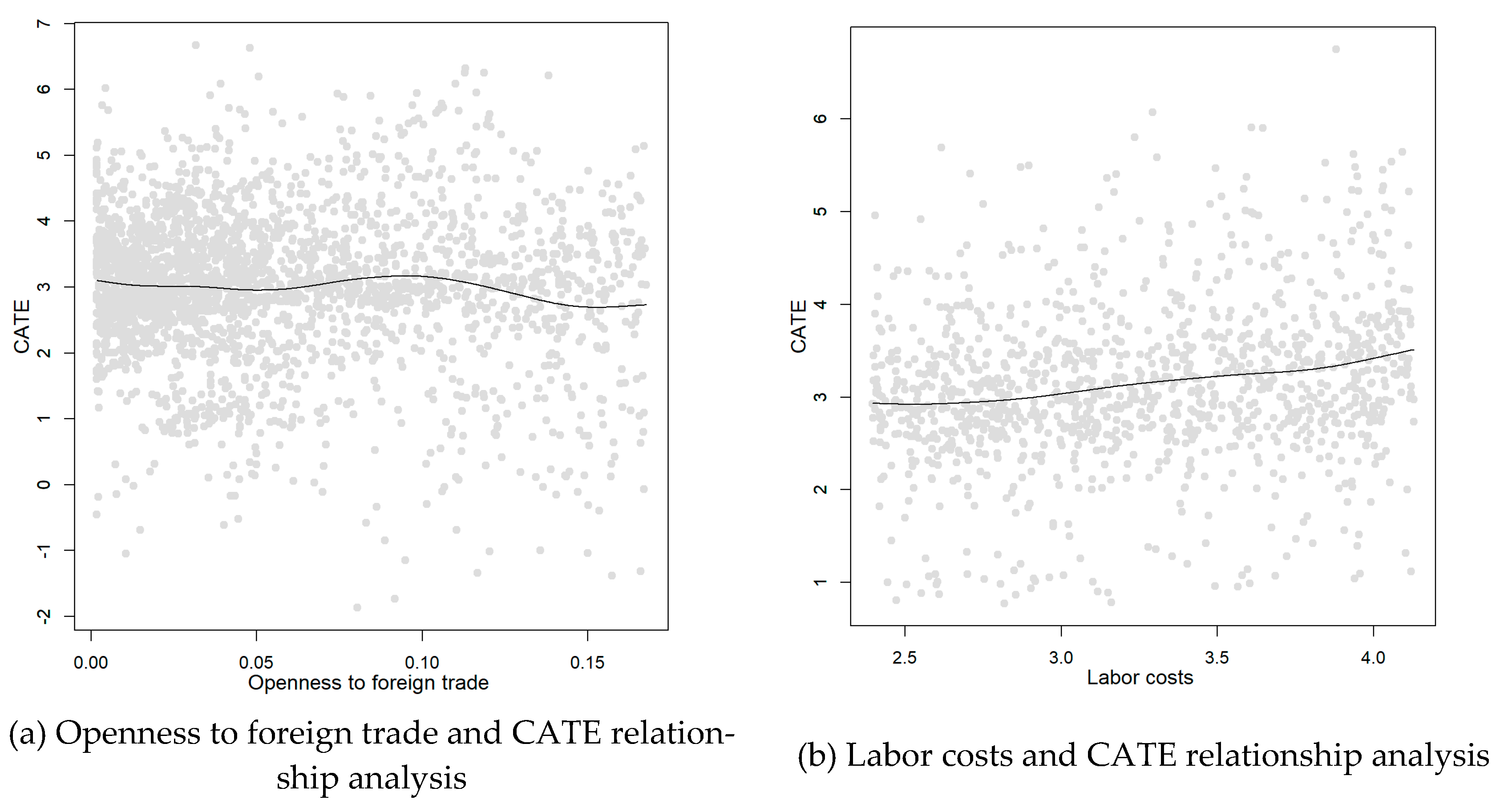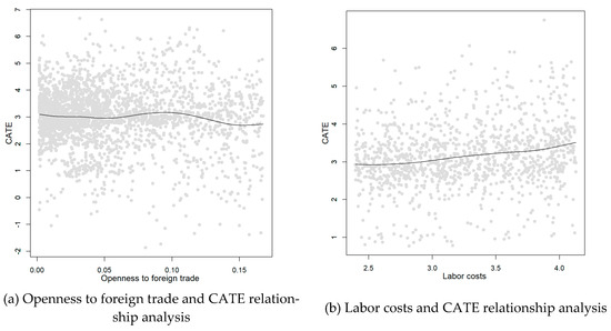 To examine heterogeneity in treatment effects, the Causal Forest model is employed to estimate CATEs across subpopulations. Variable importance is determined by the frequency and effectiveness with which each covariate is used for splitting, particularly when appearing at higher tree levels and contributing to variance reduction in treatment effect estimates. Based on this criterion, “openness to foreign trade” and “labor costs” are identified as the most influential factors. Their selection is further supported by theoretical relevance: openness reflects regional integration into global markets, while labor costs affect enterprises’ incentives for automation and industrial upgrading. These two dimensions are therefore used in subsequent subgroup analysis. The relationship between them and CATE is shown in Figure 5.