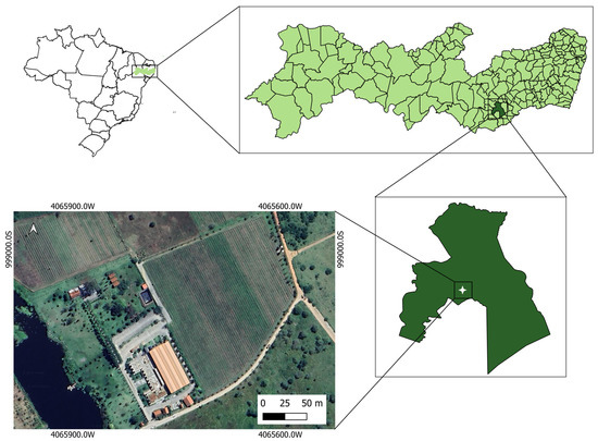 The study was conducted at Vale das Colinas Winery, located in Garanhuns, Pernambuco State, Brazil (8°56′19′′ S, 36°31′21′′ W) at 800 m above sea level (Figure 1). The climate is humid and classified as “As” (Köppen). The region has an average annual temperature of 20 °C and an average annual rainfall of 1300 mm [29]. The soil has been classified as a dystrophic Red-Yellow Argisol with a sandy loam texture, according to the Brazilian Soil Classification System [30]. The chemical properties of the experimental soil are in Table 2.