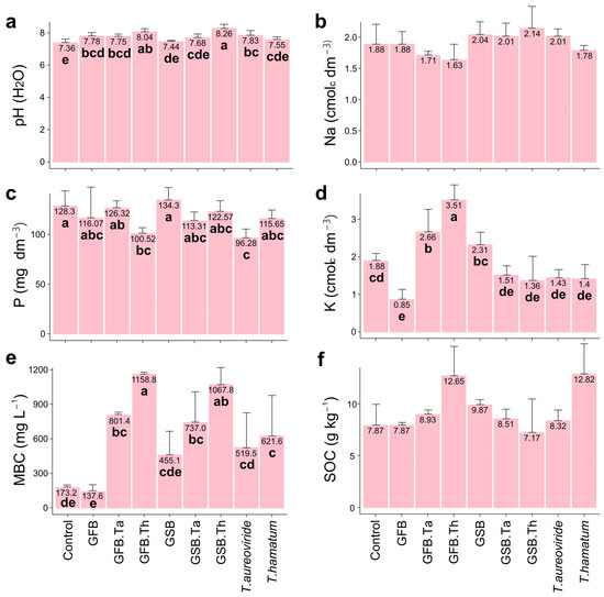 Chemical and biological attributes of soil subjected to different biochar sources and Trichoderma isolates and cultivated with grape plants of the Malbec cultivar. (a) pH, (b) Na, (c) P, (d) K, (e) Microbial biomass carbon (MBC), (f) Soil organic carbon (SOC). Error bars represent the standard error (SE) based on four experimental replicates. Treatments marked with distinct lowercase letters differ significantly (p < 0.05). Treatments: control (Ctrl); grape stalk biochar (GSB); grape fermentation biochar (GFB); Trichoderma aureoviride URM 5158 (Ta); Trichoderma hamatum URM 6656 (Th); GSB combined with T. aureoviride (GSB.Ta); GSB combined with T. hamatum (GSB.Th); GFB combined with T. aureoviride (GFB.Ta); and GFB combined with T. hamatum (GFB.Th).