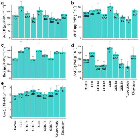 Absolute enzymatic activities of soil subjected to different biochar sources and Trichoderma isolates and cultivated with grape plants of the Malbec cultivar. (a) Acid phosphatase, (b) Alkaline phosphatase, (c) Beta-glucosidase, (d) Arylsulfatase, (e) Urease. Error bars represent the standard error (SE) based on four experimental replicates. Treatments marked with distinct lowercase letters differ significantly (p < 0.05). Treatments: control (Ctrl); grape stalk biochar (GSB); grape fermentation biochar (GFB); Trichoderma aureoviride URM 5158 (Ta); Trichoderma hamatum URM 6656 (Th); GSB combined with T. aureoviride (GSB.Ta); GSB combined with T. hamatum (GSB.Th); GFB combined with T. aureoviride (GFB.Ta); and GFB combined with T. hamatum (GFB.Th).