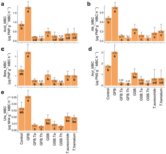 Specific enzymatic activities per unit of microbial biomass in soil subjected to different biochar sources and Trichoderma isolates and cultivated with grape plants of the Malbec cultivar. (a) Acid phosphatase/ microbial biomass carbon (MBC), (b) Alkaline phosphatase/MBC, (c) Beta-glucosidase/MBC, (d) Arylsulfatase/MBC, (e) Urease/MBC. Error bars represent the standard error (SE) based on four experimental replicates. Treatments marked with distinct lowercase letters differ significantly (p < 0.05). Treatments: control (Ctrl); grape stalk biochar (GSB); grape fermentation biochar (GFB); Trichoderma aureoviride URM 5158 (Ta); Trichoderma hamatum URM 6656 (Th); GSB combined with T. aureoviride (GSB.Ta); GSB combined with T. hamatum (GSB.Th); GFB combined with T. aureoviride (GFB.Ta); and GFB combined with T. hamatum (GFB.Th).