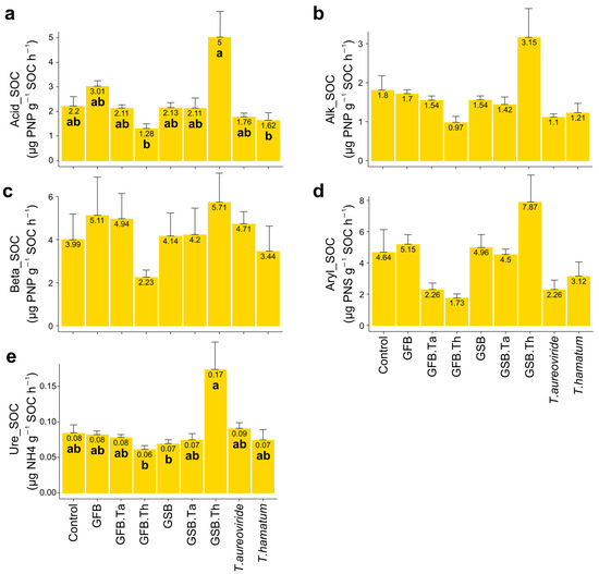 Specific enzymatic activities per unit of soil organic carbon (SOC) in soil subjected to different biochar sources and Trichoderma isolates and cultivated with grape plants of the Malbec cultivar. (a) Acid phosphatase/SOC, (b) Alkaline phosphatase/SOC, (c) Beta-glucosidase/SOC, (d) Arylsulfatase/SOC, (e) Urease/SOC. Error bars represent the standard error (SE) based on four experimental replicates. Treatments marked with distinct lowercase letters differ significantly (p < 0.05). Treatments: control (Ctrl); grape stalk biochar (GSB); grape fermentation biochar (GFB); Trichoderma aureoviride URM 5158 (Ta); Trichoderma hamatum URM 6656 (Th); GSB combined with T. aureoviride (GSB.Ta); GSB combined with T. hamatum (GSB.Th); GFB combined with T. aureoviride (GFB.Ta); and GFB combined with T. hamatum (GFB.Th).