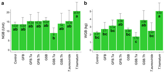 Productivity of Malbec grapevines grown in soil treated with different biochar sources and Trichoderma isolates. (a) Number of grape bunches; (b) Total bunch weight per plant. Error bars represent the standard error (SE) based on four experimental replicates. Treatments marked with distinct lowercase letters differ significantly (p < 0.05). Treatments: control (Ctrl); grape stalk biochar (GSB); grape fermentation biochar (GFB); Trichoderma aureoviride URM 5158 (Ta); Trichoderma hamatum URM 6656 (Th); GSB combined with T. aureoviride (GSB.Ta); GSB combined with T. hamatum (GSB.Th); GFB combined with T. aureoviride (GFB.Ta); and GFB combined with T. hamatum (GFB.Th).