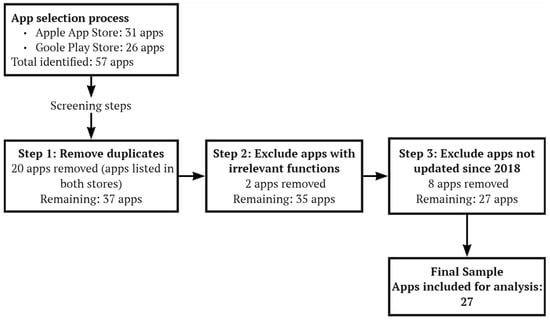 The identification of WMAs involved a systematic search conducted on the Apple App Store and Google Play Store. Initial searches occurred between 20 and 30 March 2023, followed by a second review on 13 September 2024 to account for changes in app availability, development status, and popularity trends. Although this 10-day search period may appear brief, it was focused and systematic, using defined keywords across multiple platforms (Apple App Store and Google Play) to generate a preliminary sample of applications. This was followed by iterative screening, evaluation of app content and reviews, and ongoing validation over the following months, ensuring that only actively used and functionally relevant apps were retained.