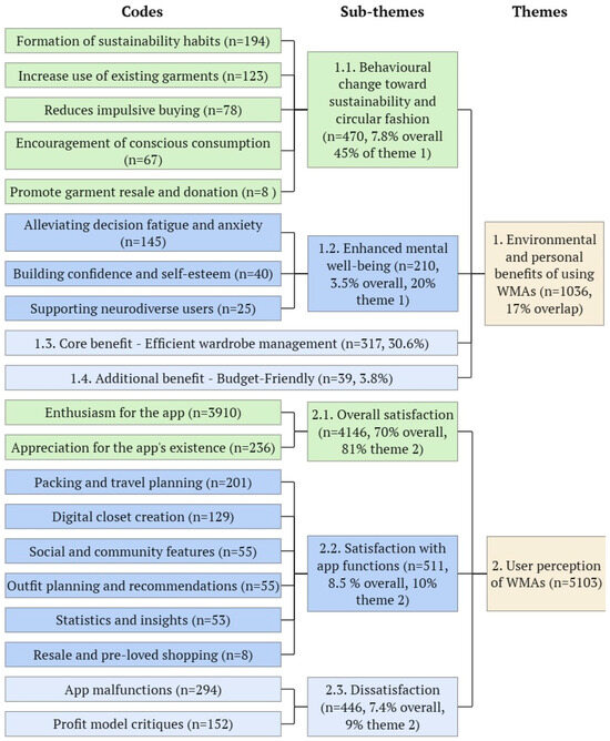 WMAs have demonstrated significant potential to influence consumer behaviour, promoting more sustainable fashion practices by encouraging mindful consumption and reducing overconsumption. As Figure 2 shows, through thematic analysis of user reviews (Sub-theme 1.1: Behavioural change toward sustainability and circular fashion, n = 470, 7.8% overall, 45% of theme 1), key behavioural changes were identified, aligning with established sustainability frameworks, such as slow fashion principles [57] and circular fashion practices [58].