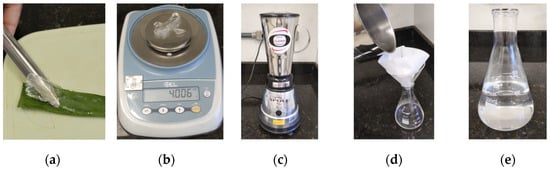 The preparation process followed a standardized protocol, in which 2 g of Aloe vera gel (Figure 1b) was added to 50 mL of tap water, resulting in a 40 mg/mL solution. The mixture was homogenized in a blender for 1 min to promote gel emulsification (Figure 1c). Subsequently, the solution was filtered using filter paper placed over a beaker (Figure 1d) to remove solid residues, ensuring a homogeneous solution for the experimental tests (Figure 1e).