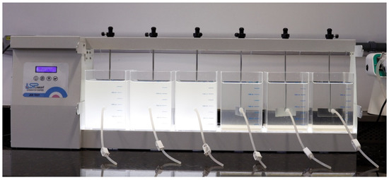 Experiments performed with the jar test apparatus were conducted to evaluate the efficiency of the coagulant in regard to turbidity removal under controlled laboratory conditions. The tests were performed using jar test apparatus equipped with six 2 L beakers (Figure 2), which were filled with the synthetic water prepared as described in Section 2.2.