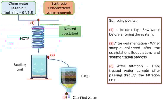 Following the jar test assays, the efficiency of the natural coagulant was evaluated in a laboratory-scale hydraulic system, which consisted of a helically coiled tube flocculator (HCTF), a conventional sedimentation system, and a rapid filter (Figure 3). This system was designed to simulate the conditions more representative of continuous water treatment systems, enabling the assessment of the coagulant’s feasibility in an alternative clarification setup. In Figure 3, the sampling points are indicated as follows: (1) raw water inlet—represents the initial turbidity of the water before treatment; (2) after sedimentation—measures the turbidity following the coagulation, flocculation, and sedimentation processes; (3) after filtration—the final turbidity measurement following the filtration step.