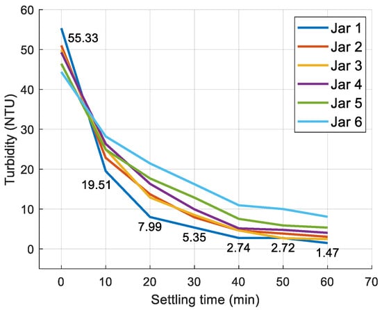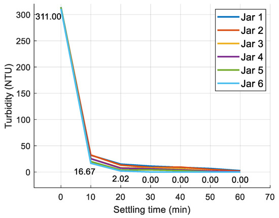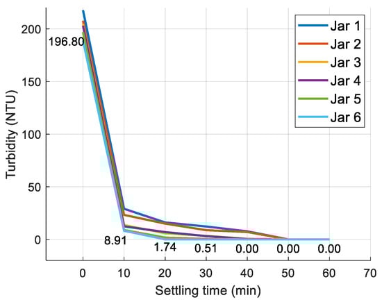 Next, the mixture was conveyed to the sedimentation unit, where flocculated particles were removed via gravitational settling. During this process, samples were collected every 10 min to determine the residual turbidity, allowing an efficiency analysis of the coagulant over time.