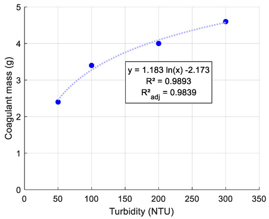 Understanding this relationship is essential for process optimization, as it enables precise coagulant dosage adjustments, ensuring operational efficiency while minimizing the waste in water treatment. These findings suggest that the relationship between the initial turbidity and required coagulant mass follows a nonlinear trend, approaching a logarithmic behavior, where the coagulant dosage increases are not directly proportional to the initial turbidity increments.