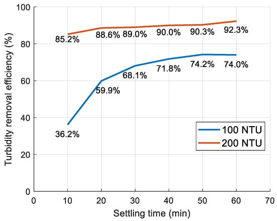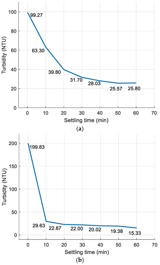 The turbidity variation over time for both tests showed a significant reduction within the first 10 min, followed by a more gradual decline throughout the experiment. In Test 1 (100 NTU), the initial average turbidity was 99.27 NTU, decreasing to 63.30 NTU at 10 min and reaching 25.80 NTU by the end of 60 min. In Test 2 (200 NTU), the initial average turbidity of 199.83 NTU rapidly dropped to 29.63 NTU at 10 min, further decreasing to 15.33 NTU at the end of the experiment.