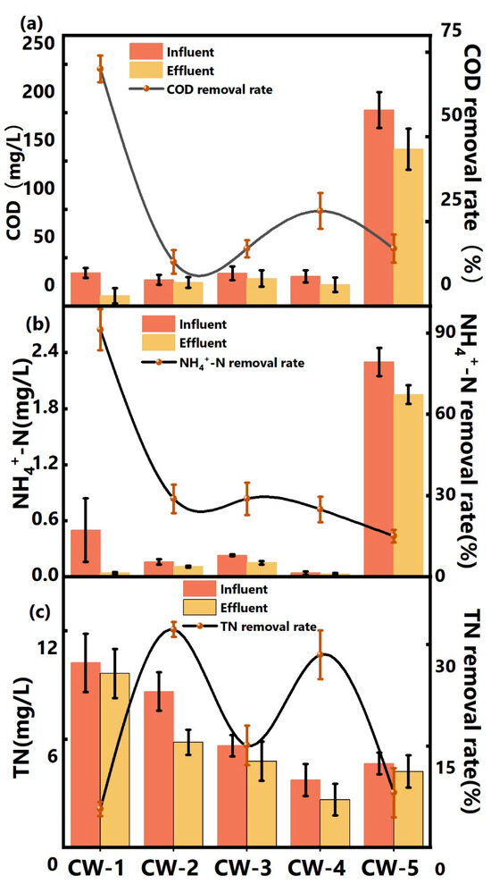 Figure 1. The water quality of the influent and the effluent from different constructed wetlands. (a) COD and COD removal efficiency; (b) TN and TN removal efficiency; (c) NH4+-N and NH4+-N removal efficiency.
