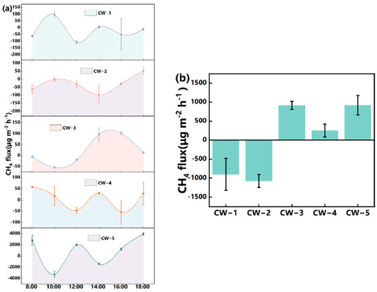 Figure 2. Variation in CH4 emission fluxes from different constructed wetlands. (a) CH4 emission curve in the daytime; (b) average CH4 emission flux in the daytime.