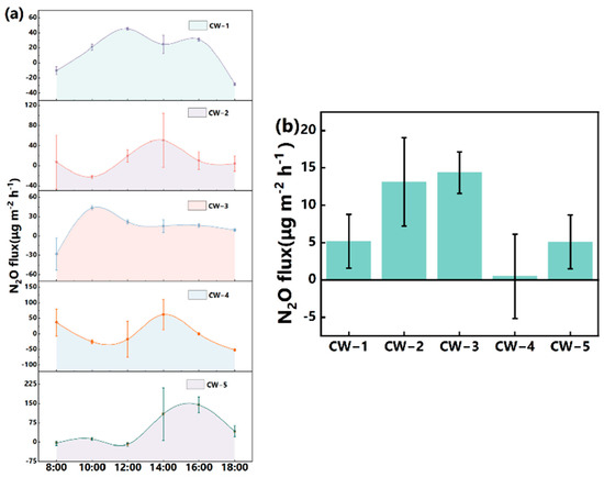 Figure 3. Variation in N2O emission fluxes from different constructed wetlands. (a) N2O emission curve in the daytime; (b) average N2O emission flux in the daytime.