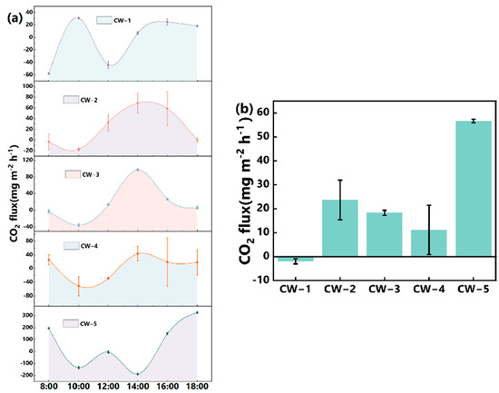 Figure 4. Variation in CO2 emission fluxes from different constructed wetlands. (a) CO2 emission flux in the daytime; (b) average CO2 emission flux in the daytime.