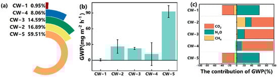 The ratio of GWP for each CW among all CWs showed the largest proportion, up to 59.51%, in CW-5 (Figure 5a). The second largest was from CW-2 with 16.89%. Both CW-1 and CW-4 exhibited a less than 10% among all CWs, in which CW-1 only stood for 0.95%. The average GWPs for all CWs were over zero, suggesting all CWs result in GHG sources (Figure 5b). The lowest GWP was 1.510 mg CO2-eq m−2 h−1 from CW-1, while the highest GWP was 94.874 mg CO2-eq m−2 h−1 from CW-5. The contribution of each GHG on the GWP capacity for CWs is shown in Figure 5c. From the perspective of source sink, CW-1 and CW-2 have two kinds of contributions, but the other wetlands are all source contributions. From the point of view of gas, CH4 accounted for a relatively small contribution in each wetland, except for CW-5, which accounted for a relatively large contribution of methane. N2O can exist as the second largest contribution gas in the contribution ratio of all wetlands, except CW-1 wetland, where N2O contribution is the largest. Except for CW-1, other wetlands accounted for the largest proportion of CO2 contribution as source and the second largest proportion of CO2 contribution in CW-1, and the contribution type was sink.