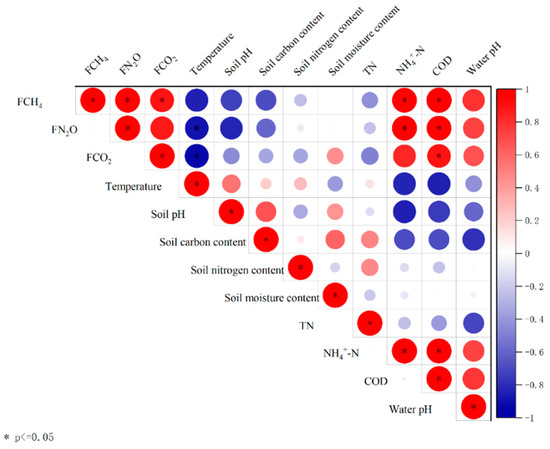 Figure 6. Pearson correlation analysis between greenhouse gases and environmental factors in constructed wetlands. * denotes the significant difference between sample, p < 0.05, calculated by t-test.
