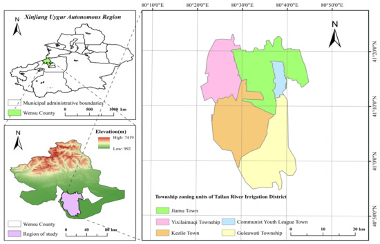 The Tailan River Irrigation District is located in the eastern part of Wensu County, Aksu Prefecture, Xinjiang (Figure 1). It is located on the northern edge of the Tarim Basin, the southern foot of the Tianshan Mountains (80°20′–80°45′ E, 40°55′–41°25′ N). It is one of the key areas for the construction of grain, cotton, and oil bases, livestock product bases, and fruit bases [36]. According to the meteorological statistics for many years, the average annual precipitation in the region is 82.6 mm, the average annual sunshine duration is 2618.7 h, and the average annual temperature is 11.67 °C. The irrigation district mainly relies on the surface and groundwater resources of the Tailan River and its tributaries to serve the surrounding vast agricultural areas, it plays a pivotal role in safeguarding regional food supplies, stimulating sustainable socioeconomic growth, and preserving ecosystem integrity.