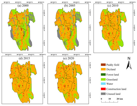 As illustrated in Figure 2, dryland and grassland collectively constituted over 80% of the Tailan River Irrigation District’s land area throughout the 2000–2020 period, maintaining their dominance as primary LU categories. Additionally, the increase and decrease of LU in its interior is also obvious. The most notable change occurred in dryland coverage, which surged from 45.75% of the total area in 2000 to 82.8% by 2020, representing a 37.05 percentage point increase. Construction land increased from 1.65% to 3.12%. The national and local “oasisization” and “food security” policies have significantly expanded dryland agriculture in irrigated districts [57]. Meanwhile, rising global temperatures have prompted a shift in agricultural practices across arid regions like Xinjiang, with a growing emphasis on drought-resistant crops. This transformation has further entrenched the dominance of dryland agriculture in regional LU patterns. Additionally, the increasing population density in oasis areas has created a strong demand for residential land, which has driven the expansion of urban and construction LU [57].