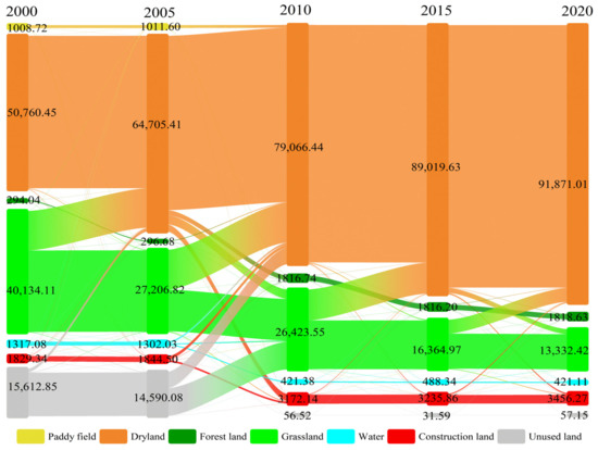 Combined with Figure 2 and Figure 3, it can be seen that from 2000 to 2020, dryland and construction land are the two categories of land with the biggest turn-in area in the irrigation district, and their turn-in areas are 41,110.56 hm2 and 1626.93 hm2, respectively. Grassland and unused land are the two categories of land with the biggest transfer-out areas in the irrigation district, and the transfer areas are 26,801.69 hm2 and 15,555.7 hm2, respectively. In addition, unused land is the biggest proportion of land transferred to grassland, while grassland is the biggest proportion of land transferred to dryland. The land conversion area is mostly concentrated in the eastern part of Jiamu Town, the central part of Yixilaimuqi Township, the southeastern part of Guleawati Township, and the southwestern part of Kezile Town. At the same time, the area of forest land and water area in the irrigation district showed a trend of increasing fluctuation and decreasing fluctuation from 2000 to 2020. The reason is that they are deeply related to the urbanization development behind the irrigation district, the increasing expansion of construction land year by year, and the active exploration of the development and utilization of a large amount of unused land.