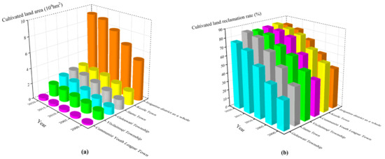 The cultivated land area and reclamation rate of each township unit in the Tailan River Irrigation District showed a gradually increasing trend between 2000 and 2020. The total cultivated land area increased by 40,101.84 hm2, and the reclamation rate increased from 46.66% in 2000 to 82.8% in 2020 (Figure 4). In the five units of the irrigation district, the area of cultivated land in Guleawati Township increased the most from 2000 to 2020, which was 12,182.67 hm2, but the reclamation rate of cultivated land was only 76.37%, which was lower than that of other units in the same period. On the contrary, the cultivated land area of the Communist Youth League Town increased the least, only 1695.33 hm2, but its reclamation rate increased by 43.11% from 2000 to 2020, and the reclamation rate reached 84.82% by 2020, and the utilization of cultivated land remained at a high level. In addition, the cultivated land reclamation rate of Kezile Town, Yixilaimuqi Township, Communist Youth League Town (only 41.71% in 2000), and Jiamu Town (only 43.72% in 2000) remained above 50% for many years, reflecting that the cultivated land resources of each unit have been fully reclaimed and utilized.