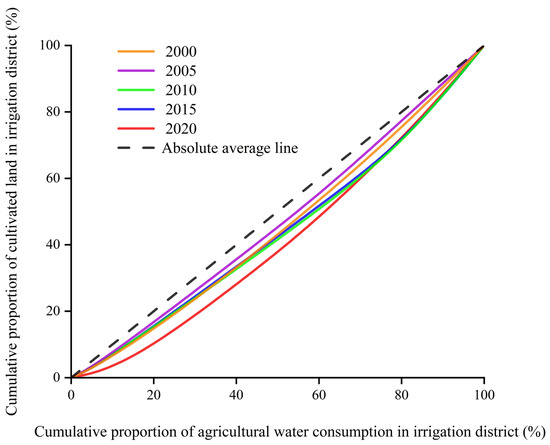 Lorenz curve of the Tailan River Irrigation District from 2000 to 2020.
