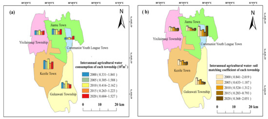 - The years 2010 and 2015 were those with the most and least agricultural water consumption in the irrigation district. Although the agricultural water consumption of Kezile Town ranked first in each unit, the agricultural water–soil matching situation was not the best and was always fluctuating. On the contrary, although the Communist Youth League Town had the least amount of agricultural water consumption over the years, the matching status of agricultural water–soil remained the best for many years. In addition, the overall agricultural water–soil matching coefficient of the irrigation district gradually decreased from 1.058 in 2000 to 0.426 in 2015, and increased to 0.538 until 2020, reflecting the profound influence of agricultural water consumption and cultivated land reclamation rate on water–soil matching in the irrigation district.