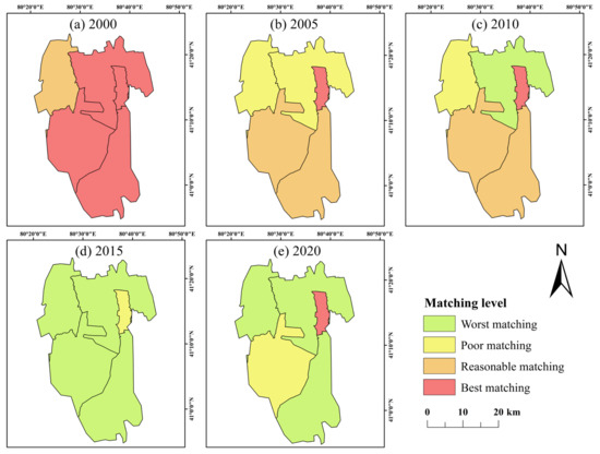 The spatiotemporal distribution of agricultural water–soil matching in the irrigation district was further highlighted. Referring to the previous research methods [17], the natural breakpoint method in ArcGIS10.8 was used to classify the agricultural water–soil matching coefficients of each unit in each period, which are as follows: worst matching (0.283~0.524), poor matching (0.524~0.720), reasonable matching (0.720~0.921), and best matching (0.921~2.051) (Figure 7). The agricultural water–soil matching status of each unit in the irrigation district in 2000 was reasonable or above, reaching the best state in the study period; the worst was in 2015, and the agricultural water–soil matching of each unit was poor and below.