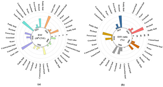ESV changes of different LU categories in the Tailan River Irrigation District from 2000 to 2020. (a) ESV; (b) ESV ratio.