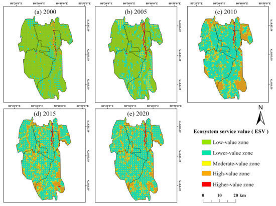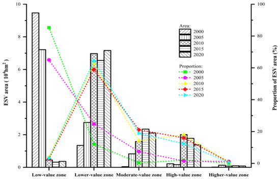 Combined with Figure 11, it is found that the ESV in the Tailan River Irrigation District showed an increasing trend between 2000 and 2020. The area of ESV low-value zones in the irrigation district remained at 2.89% and above in each period. Before 2010, it was widely distributed in each unit of the irrigation district, and then sharply decreased to sporadic point distribution. The area of the ESV lower-value zones increased significantly and accounted for a large proportion, it was widely distributed in each unit of the irrigation district in 2010 and after, and the zones increased by 58,189.14 hm2 from 2000 to 2020. Different from the former two, the areas of ESV moderate-value zones and high-value zones in the study period generally showed the fluctuation characteristics of increasing first and then decreasing. The area of ESV moderate-value zones had a maximum increase of 20.74%, which was scattered in each township unit. The area of ESV high-value zones increased by 16.59%, and it was mainly distributed in local points, strips, and sheets from 2010 onwards in the southeastern part of Guleawati Township, the central part of Yixilaimuqi Township, and the central and eastern parts of Jiamu Town. The area of ESV higher-value zones remained between 0.15% and 1.21% for many years, and the proportion was small.