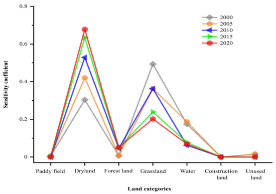 Between 2000 and 2020, the ESV sensitivity coefficient of each LU category in the Tailan River Irrigation District was less than 1, ranging from 0 to 0.68 (Figure 12). Among them, the ESV sensitivity coefficient of construction land was 0, which was the smallest among all land categories; the ESV sensitivity coefficient of dryland and forest land increased year by year, and the highest coefficient of dryland was 0.68, indicating that when the ESV of dryland increased by 1%, the total value of ecosystem services would increase by 0.68%. The ESV sensitivity coefficients of paddy fields, unused land, and grassland decreased gradually, with average values of 0.002, 0.006, and 0.33, respectively. The test results show that the equivalent coefficient VC of ESV in the irrigation district was accurate and in line with the actual situation of the irrigation district.