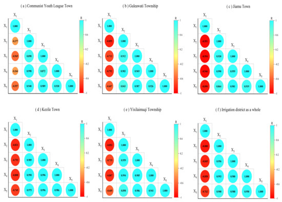 (2) The Pearson coefficient (R) can be used to reflect the linear correlation between two random variables [55]. Through this coefficient, the correlation between agricultural water–soil matching and the four ecosystem services of provision, regulation, support, and culture in the irrigation district is identified. The value of R is [−1,1]; when 0 < R < 1, the two variables are synergistic; when −1 < R < 0, the two variables are trade-offs; and when R = 0, the two variables are not related; that is, the greater the absolute value, the greater the degree of correlation [56]. Its calculation formula is as follows: