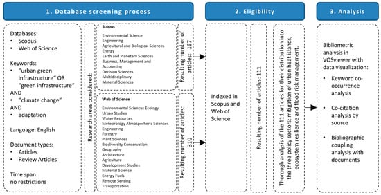 For the search of scientific articles, two of the most comprehensive and widely used databases, Scopus and Web of Science Core Collection, were selected. The Scopus database includes publications from approximately 28,000 active peer-reviewed journals worldwide, books, and conference proceedings, amounting to over 90 million records []. Similarly, the Web of Science encompasses more than 225 million publications from approximately 35,000 journals, in addition to books, conference proceedings, over 115 million patents, and over 14 million data sets []. The search was conducted on 3 July 2024, using the following keywords with Boolean operators AND and OR: (“urban green infrastructure” OR “green infrastructure”) AND (“climate change”) AND (adaptation). Only articles and review articles in English were considered.