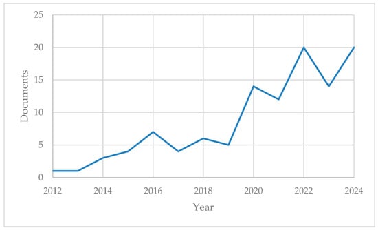 Figure 2 presents the number of scientific articles published each year on the topic of the role of GI in climate change adaptation, based on a selection of 111 scientific papers. Among the selected articles, the earliest publication was published in 2012. Over the years, there has been a noticeable increase in the number of publications, reflecting the growing interest in this area of study. This increasing trend certainly indicates a growing awareness of the need for sustainable solutions in urban planning and environmental management.