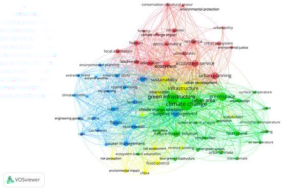Four clusters were formed during this analysis, each represented visually by different colors. The blue cluster contains keywords related to water and flood risk management, such as floods, runoff, stormwater, water management, and rain. The green cluster includes keywords like climate change, green infrastructure, green space, climate change adaptation, nature-based solutions, urban heat island, urban area, and urban planning. This cluster groups the keywords with the most frequent occurrences in the publications analyzed in the search. The red cluster contains keywords like adaptation, ecosystem services, biodiversity, and resilience. The yellow cluster, which is the smallest, includes 12 keywords such as infrastructure, land use planning, remote sensing, sustainability, urbanization, risk assessment, and risk management.