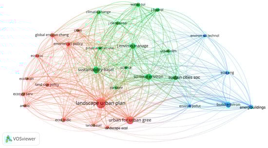 During the database screening process, only articles and review articles were selected, resulting in all 30 sources being scientific journals. These journals were categorized into three distinct clusters, each represented by a different color in Figure 4. The urban sustainability and ecosystem services cluster (red) is the largest, both in the number of journals and total citations. This cluster encompasses journals addressing topics such as urban planning, sustainability, ecosystem services, and the effects of climate change on urban and natural environments. The second largest cluster, marked in green, is the environmental management and hydrology cluster. It includes journals focused on environmental management, hydrological research, water resource management, and pollution control. The smallest cluster, shown in blue, is the urban environment and pollution management cluster, comprising journals that emphasize environmental sustainability, urban greening, pollution management, and energy efficiency in urban areas. Table 4 highlights the five most influential journals from each cluster.