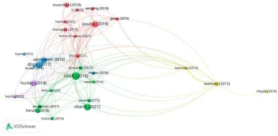 Based on the shared references, the analyzed works were grouped into five clusters. The largest is the red cluster, dominated by the works of Choi [], Maragno [], and Pauleit []. In the green cluster, the most significant works based on shared references, are Zölch [], Herath [], and Sharifi []. The blue cluster highlights Brudler [], Dong [], and Zahmatkesh []. The yellow cluster consists of three studies: Meyer [] and Wamsler [,]. Lastly, the purple cluster includes only two studies: Koch [] and Hunter [].