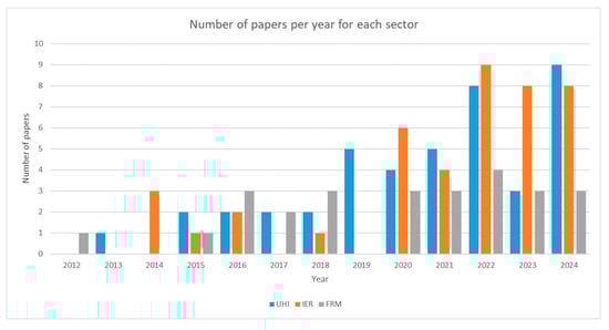 Figure 6 presents the number of papers throughout the period from 2012 to 2024. It is clear from the figure that climate change adaptation studies in three sectors have mostly been published in the last five years, especially in mitigating urban heat islands and increasing ecosystem resilience. Interest in increasing ecosystem resilience has notably grown in the last three years. A number of published papers in sector flood risk management, among the analyzed ones in this study, have been almost continuous in the last five years. Before the year 2020, studies were not that numerous, and some of the sectors had a year without published papers. Hence, it can be concluded that the role of green infrastructure in climate change adaptation has been gaining a very important role in research in recent years.