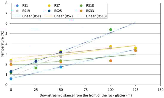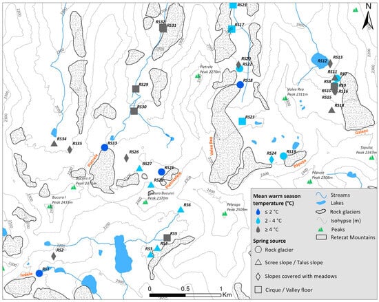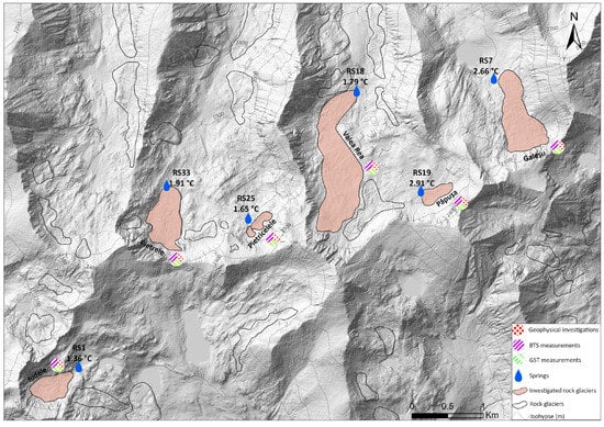 - Carturan, L.; Zuecco, G.; Andreotti, A.; Boaga, J.; Morino, C.; Pavoni, M.; Seppi, R.; Tolotti, M.; Zanoner, T.; Zumiani, M. Spring-water temperature suggests widespread occurrence of alpine permafrost in pseudo-relict rock glaciers. Cryosphere 2024, 18, 5713–5733. [Google Scholar] [CrossRef]