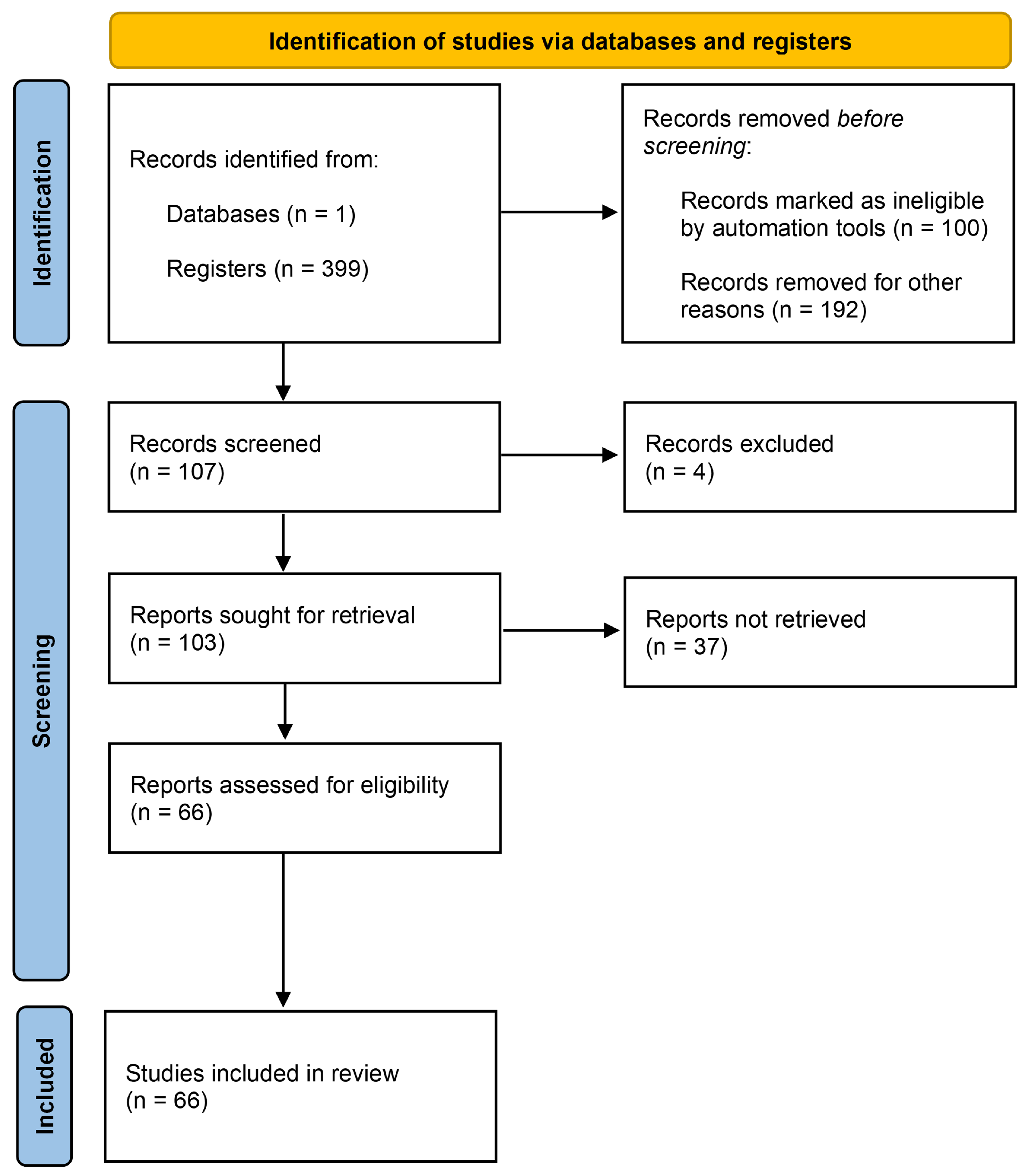 During the retrieval process from OpenAlex, 37 publications were impossible to retrieve, despite being identified as “publicly accessible”. Henceforth, the initial screening process was concluded with 66 reports assessed for eligibility.