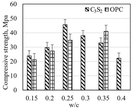 The amount water is also significant as it is needed to promote the carbonation reaction by dissolving CO2 and releasing CO32− ions. CO2 in the gaseous form cannot react directly with the cementitious material as CO2 gas must primarily be dissolved in water to form carbonate ions (carbonic acid). Subsequently, these ions react with the calcium ions of pore water. However, excessive water may compromise the rate of carbonation due to the clogging of pores and reduced carbon dioxide diffusion. In this case, a faster accumulation of precipitations on the surface is observed. At low water-to-cement (w/c) ratios, the gas permeability increases and diffusion of CO2 into the material is effectively achieved. For this reason, as has already been determined, the optimum water-to-solids (w/s) ratio is in the range of 0.06 to 0.20 [105]. However, the same degree of carbonation may require a different water content for various types of cement.